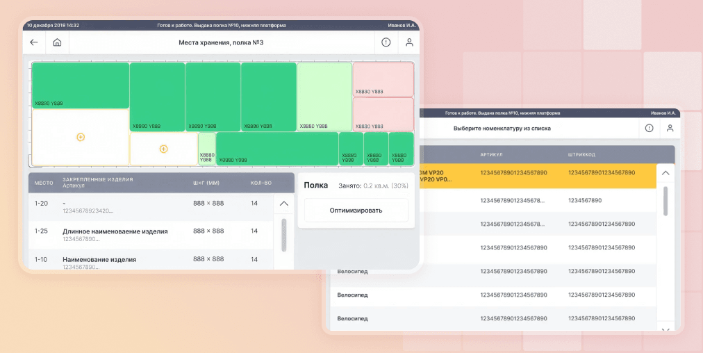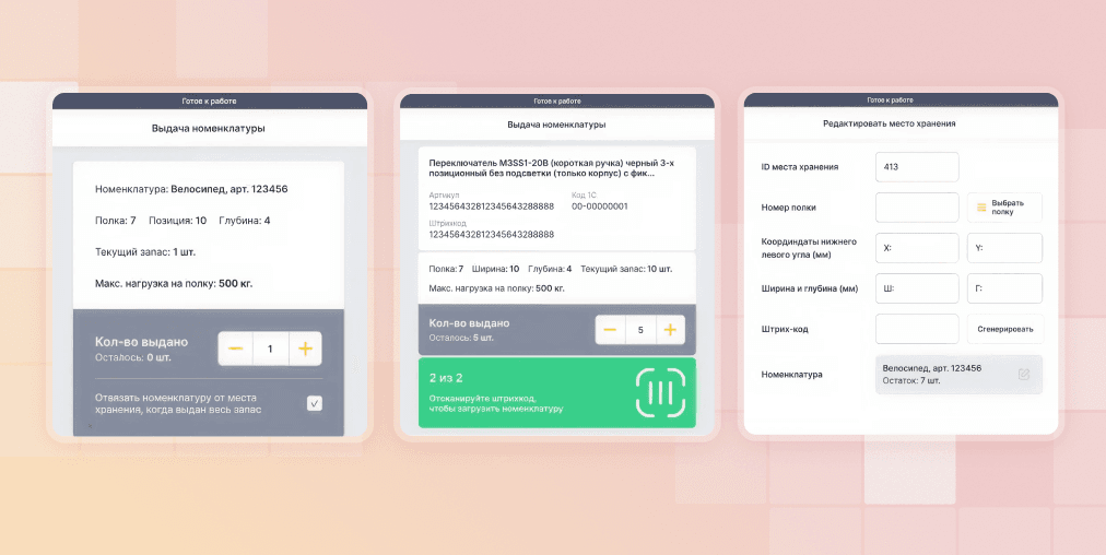 При выдаче содержимого склада происходит физическая подсветка на полке устройства и отображение ячейки полки в интерфейсе системы. Данный функционал облегчает поиск груза на полке выдачи.
