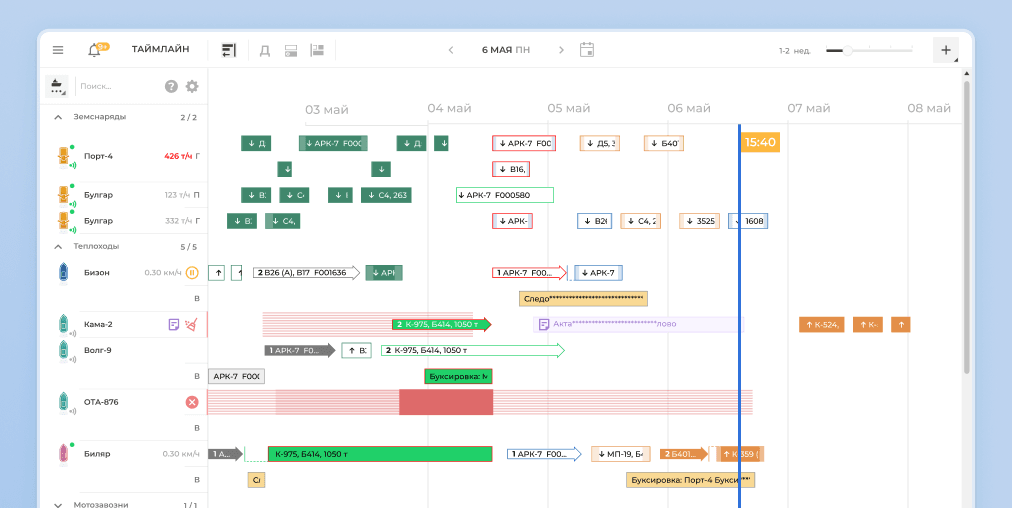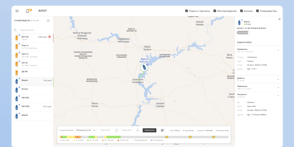 Мы реализовали в веб-приложении карту, на которой отображается текущее местоположение судов. Точные координаты поступают со специальных датчиков на судне и с GPS мобильных устройств. Также система хранит исторические данные о перемещении судов и их скорости для анализа и планирования.