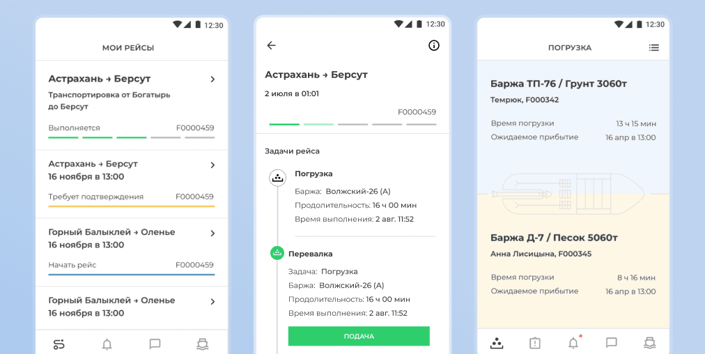 Интеграция с системой спутникового мониторинга “АвтоГРАФ” позволяет собирать и анализировать данные с датчиков для получения точной информации о перемещении судов. Дополнительно система собирает данные GPS с мобильных устройств капитанов. Использование двух источников данных снижает риск ошибок и обеспечивает точность и достоверность информации.